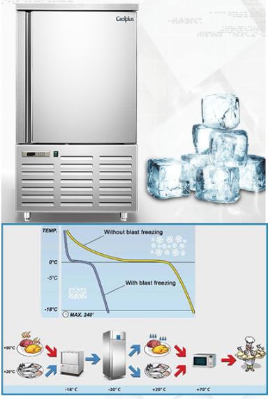 Tủ cấp đông nhanh là một thiết bị rất cần thiết trong nhà bếp. Với tủ cấp đông nhanh, bạn có thể giảm nhiệt độ của thực phẩm vừa nấu. Bạn có thể giảm nhiệt độ của thực phẩm chín từ +70 ° C xuống +5 ° C hoặc thấp hơn trong vòng 90 phút.