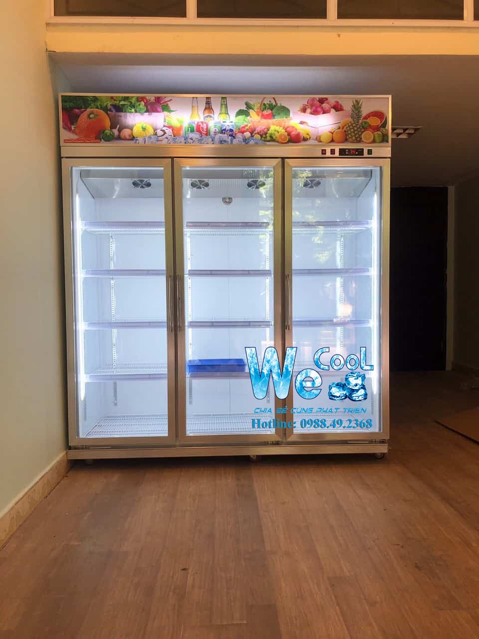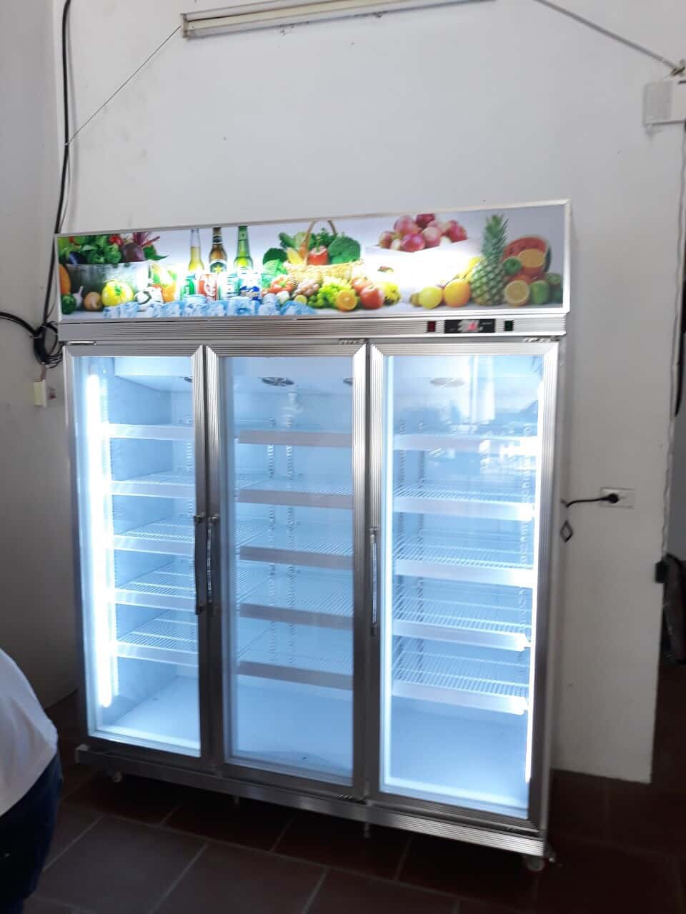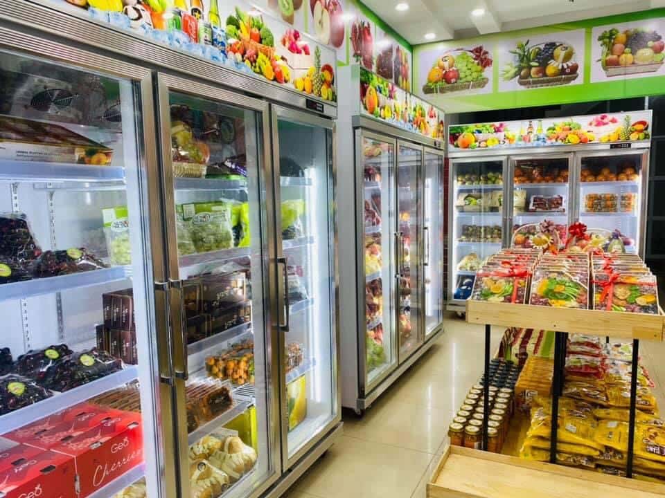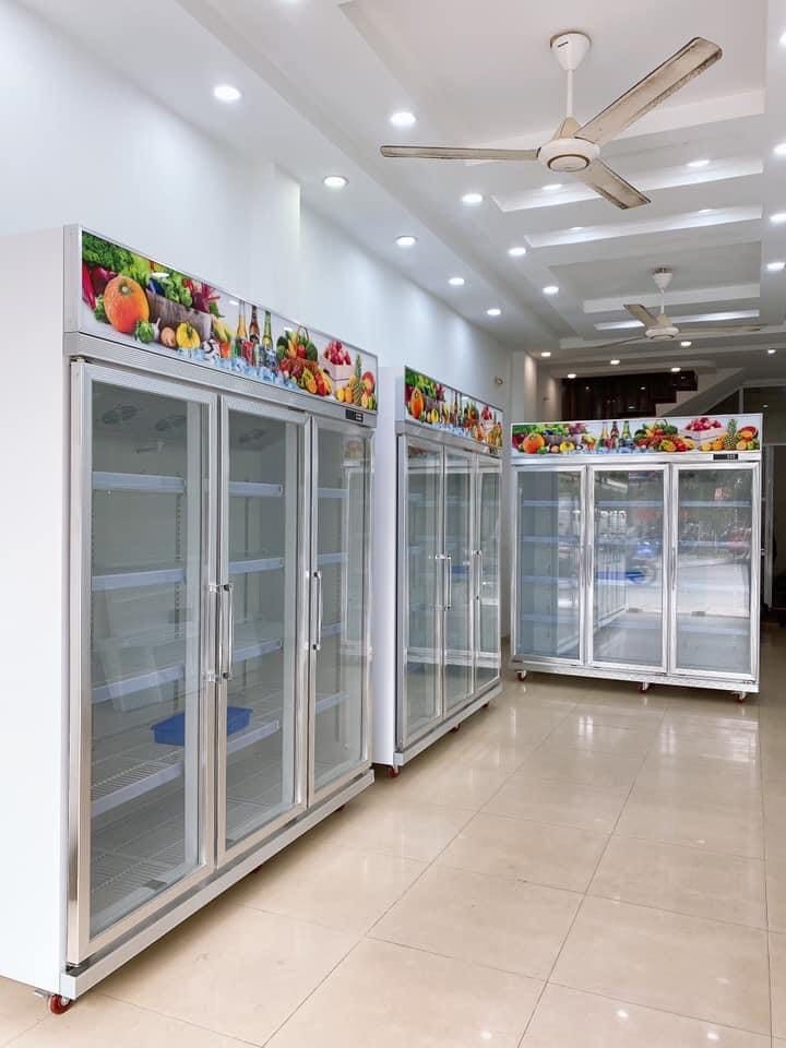- Tủ mát trưng bày hoa quả 3 cánh kính được sử dụng để trưng bày đồ uống, trái cây, rau quả, sữa, xúc xích,… trong các cửa hàng siêu thị.